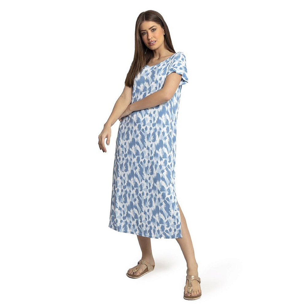 O camisão, em microfibra poliamida, é midi, tem manga curta, fenda, decote arredondado, cor azul e estampa abstrata.