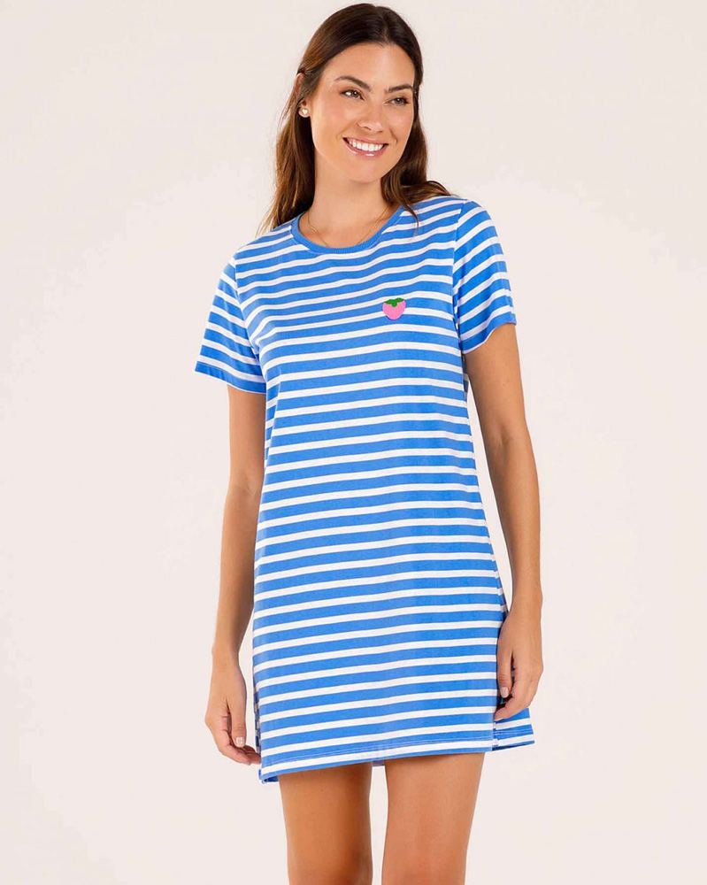 Camisola manga curta em malha de fio tinto 100% algodão. Trouxemos essa idéia em duas combinações de cores azul e rosa bem alegres para os dias de verão, e com o ícone de fruta trabalhado com efeito de um falso crochê em aplique termocolante. Decote redondo em ribana canelada contrastante. Modelagem dress, bem versátil e funcional para o dia a dia.