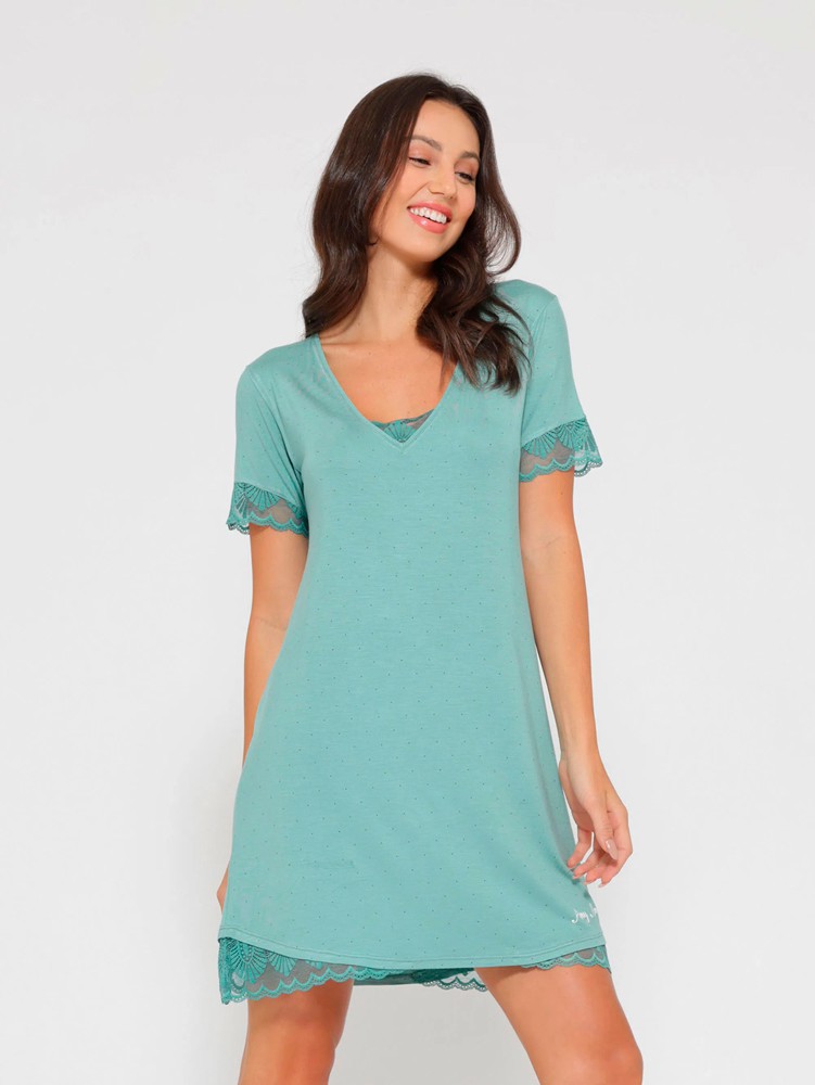 • Possui detalhes em renda delicada nas mangas, no decote e na barra;