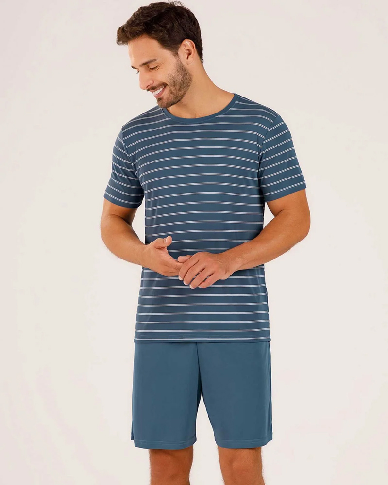 Pijama manga curta em Microfibra 100% poliamida, possui um toque leve, suave e muito refrescante. A blusa é em fio tinto e a bermuda em cor lisa, com uma pegada clean e minimalista. Bermuda com cintura de elástico 3cm.