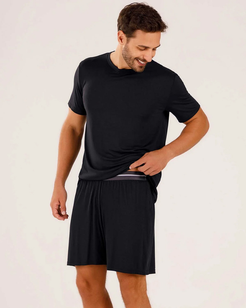 Pijama manga curta masculino todo em malha visco comfy com toque leve e super confortável, bermuda mais reta com o cós em elástico personalizado de listra, dando um ar mais esportivo e moderno! Disponível em duas variantes de cor.