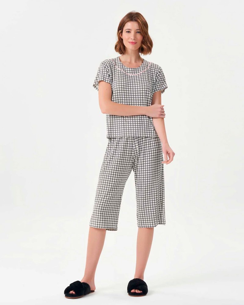 Pijama manga curta com calça capri em malha visco comfy, super macia e comfortável. Blusa com decote redondo e detalhe de viés embutido rosa. Mangas com acabamento em punho com viés rosa contrastante. Plaquinha de metal personalizada na lateral esquerda de quem veste. Calça com cintura de elástico 2cm. modelagem reta. Estampa de pied de poule, um clássico de inverno.