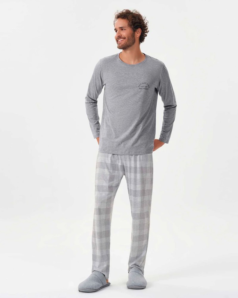 Pijama manga longa em malha mescla com estampa rotativa xadrez em tons de cinza, deixando a peça clean e delicada! Decote em ribana canelada. Frente com estampa localizada na lateral esquerda de quem veste. Calça com cintura de elástico 3cm e modelagem reta. Opção de coordenado para toda família.
