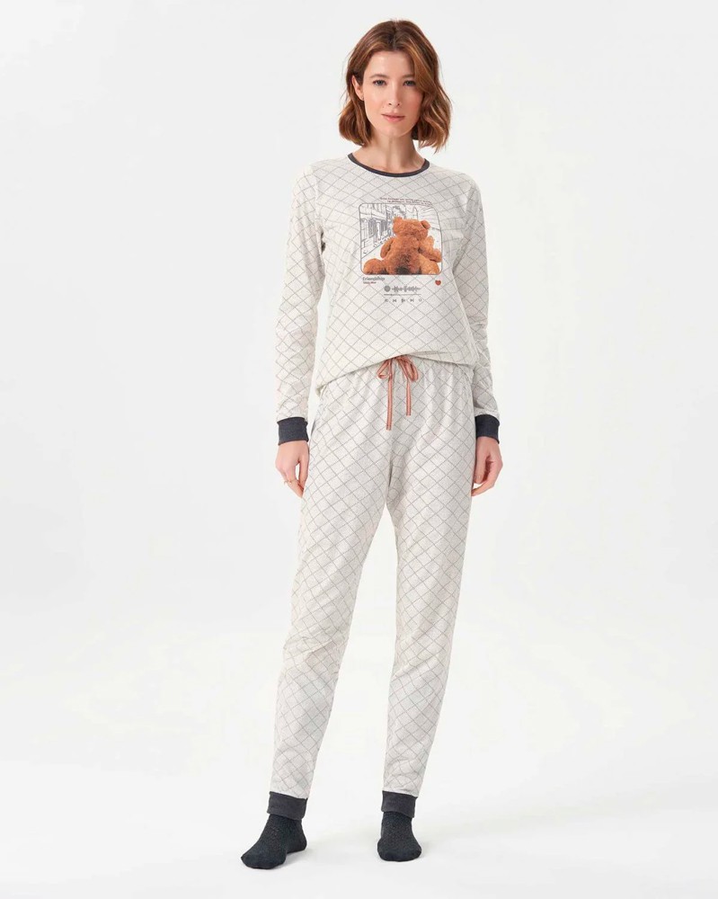 Pijama manga longa em malha comfort 100% algodão. Estampa rotativa com efeito de trama em tons de cinza com estampa localizada de ursinhos. Trouxemos uma proposta de interação com a camisola!! Você pode scanear o QRCode e curtir uma playlist muito legal que preparamos com muito carinho para você! Esse coordenado conta com a opção mãe e filha!